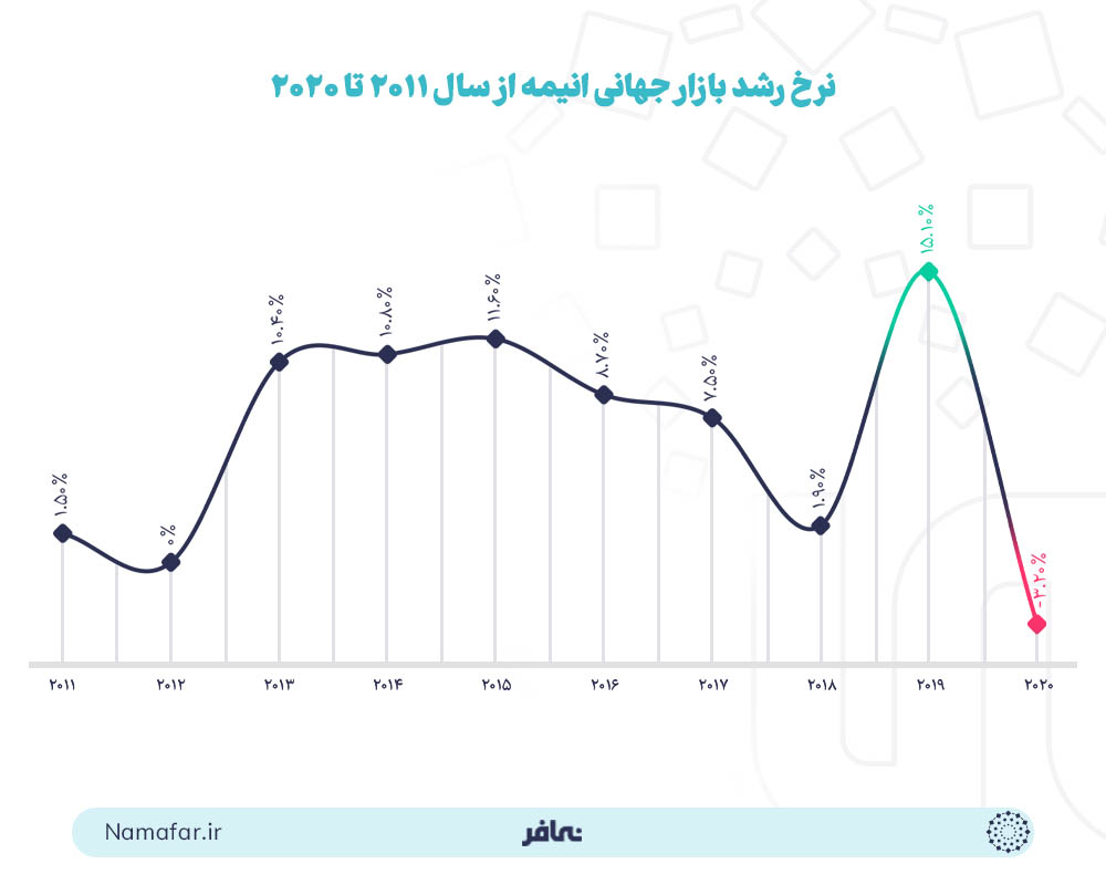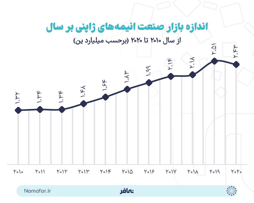اندازه ی بازار جهانی انیمه تو سال 2022 یک چیزی حدود 28.61 میلیارد دلار بوده و با توجه به میانگین رشد 9.8 درصدی انیمه تو سال های قبلی ، احتمالا تو سال 2030 به حدود 60 میلیارد دلار برسه.