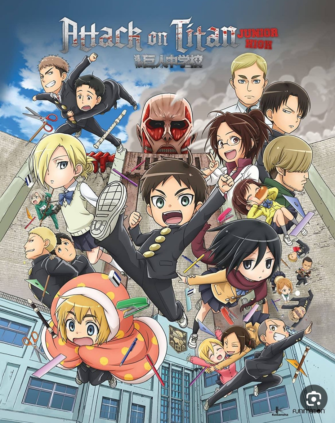 یکی از بانشاطترین آثار در مجموعه حمله به تایتان، این مانگا است. مانگای حمله به تایتان: مدرسه راهنمایی، اثری کمدی است که کاراکترهای حمله به تایتان را به عنوان دانشآموز و استاد در مدرسهای راهنمایی در ژاپن مدرن متصور شده است. در این جهان نیز تایتانها وجود دارند اما چندان تهدیدی برای بشریت محسوب نمیشوند و عملا موجوداتی بیآزار هستند.