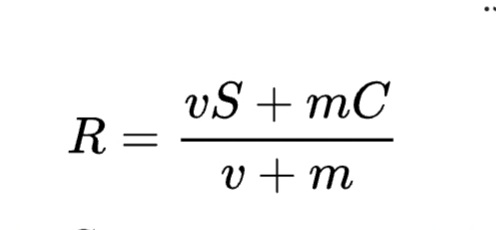 متغیر v مخفف کل آرا کاربرانه ، متغیر S برای میانگین امتیاز کاربر، متغیر m برای حداقل تعداد آرا مورد نیاز برای گرفتن نمره محاسبه شده (تا امروز ۵۰ آرا نیازه), و متغیر C برای میانگین امتیاز در کل پایگاه داده.